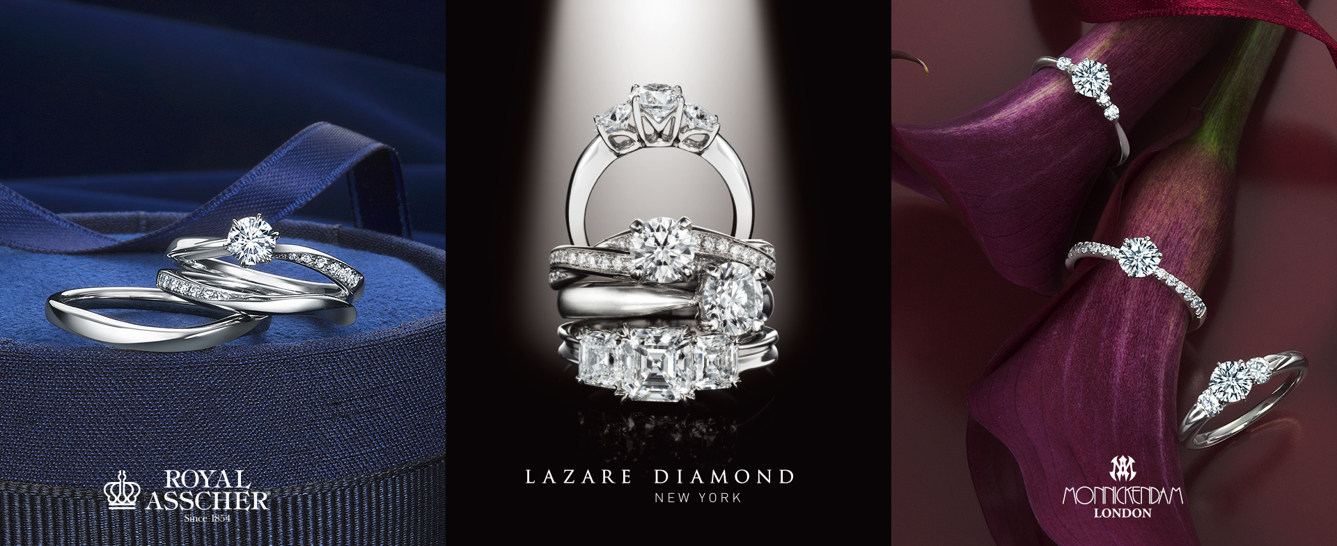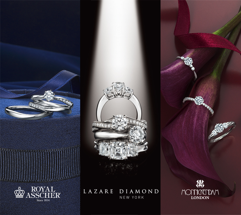 TAKEUCHI BRIDALは婚約指輪・結婚指輪の専門店として日本で初めて世界3大カッターズブランド『ロイヤル・アッシャー』『ラザールダイヤモンド』『モニッケンダム』を、一度に見比べることができます。それぞれ特長の異なる美しいダイヤモンドの輝きを、是非ご体感ください。