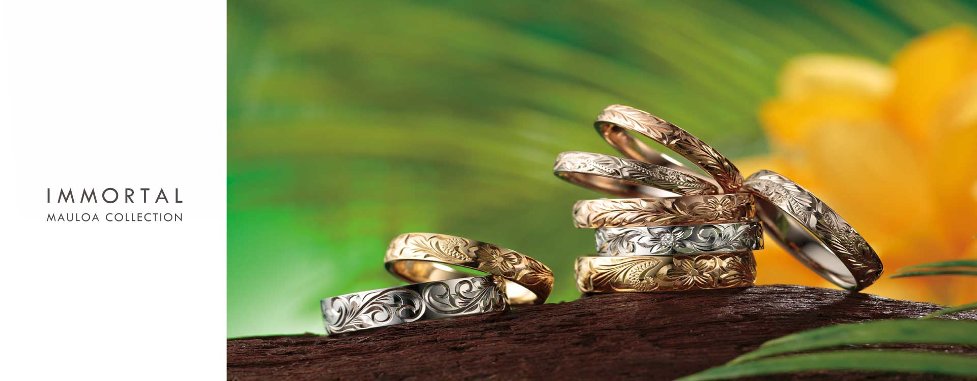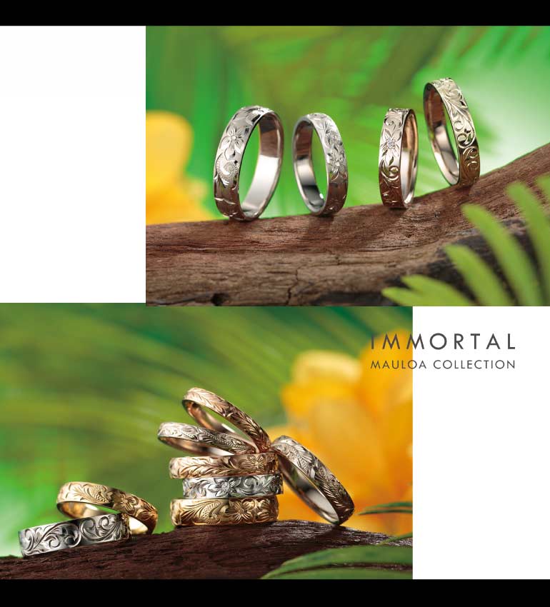 「不滅の愛」をリングに刻んで…永遠に消えない、二人の愛。抜群の強度を誇る“鍛造づくり”のリングに熟練の職人が、ひとつひとつ丹念にハワイアンの彫り模様と和の彫り模様を施すセミオーダーマリッジブランド。ずっと消えない「二人の想い」をリングに刻みつけて…。