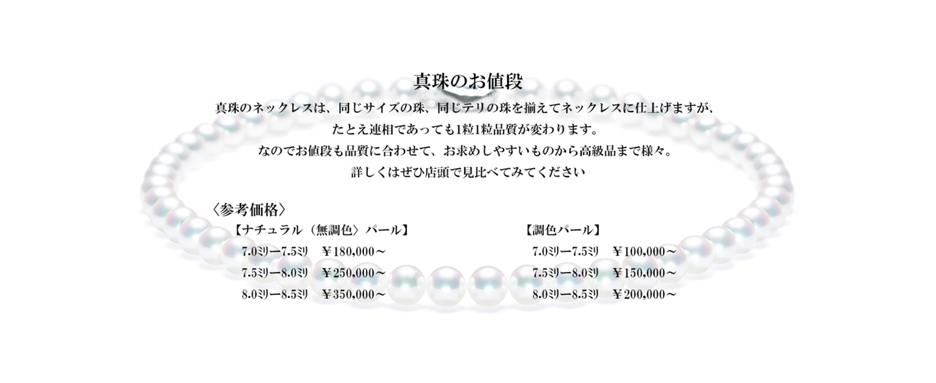 洗練された美しさもメリットの一つですが、最大のメリットは経年変化への強さです。無調色なので、時が経過しても劣化が非常にしづらい真珠となっております。
