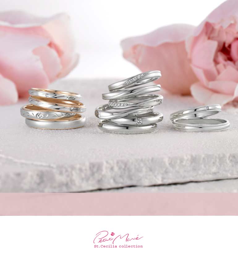 プチマリエ ブライダル コレクション。永遠を約束する薔薇の指輪 ローズ・マリッジ。薔薇のブーケ&ブートニアに託す幸福への祈り聖人「St.Cecilia」をイメージした慈愛あふれるマリッジリング・コレクション