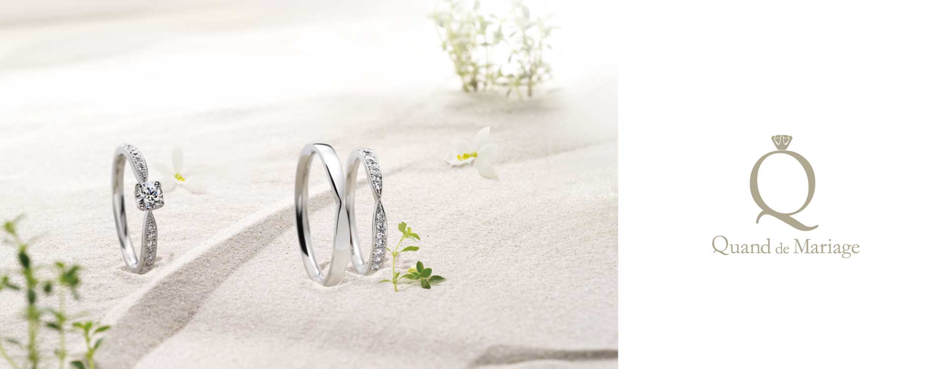 「Quand(クワン)」とは、フランス語で時・いつもを意味します。ふたりの出逢いや、これまで過ごしてきた大切な時間をいつまでも大切にしてほしいという願いが込められたブランド名です。Quand de Mariageでは、品質やアレンジのバリエーションにこだわり、ふたりらしさを100%叶えるオンリーワンリングをお作りいたします。これからもずっと一緒に歩んでいける喜びをふたりだけの特別なリングに刻んで…