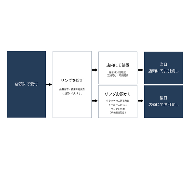 店頭でできないものは自社工房、またはメーカー工房にて処置するため、約4週間程度のお日にちをいただきます。