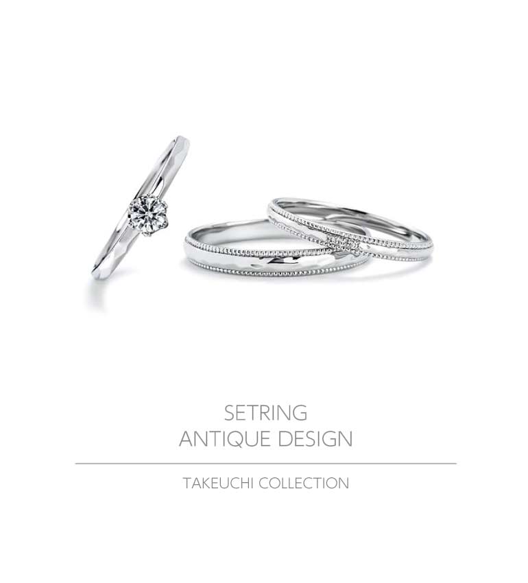 アンティークとは100年以上時を刻んだ価値のあるもの。ジュエリーにも歴史を刻み、その思い出と想いを受け継ぐものとして古くから愛されてきました。アンティークのデザインは当時の技術の最高峰としての細工を手作業で施した、まさに芸術作品。婚約指輪と結婚指輪に施したアンティークデザインは、そのおしゃれなデザイン性を叶えつつ普段から使用するにふさわしい着け心地を実現。お色味の変化でデザインのイメージが変わりますので、コーディネートしてみても楽しいですね!