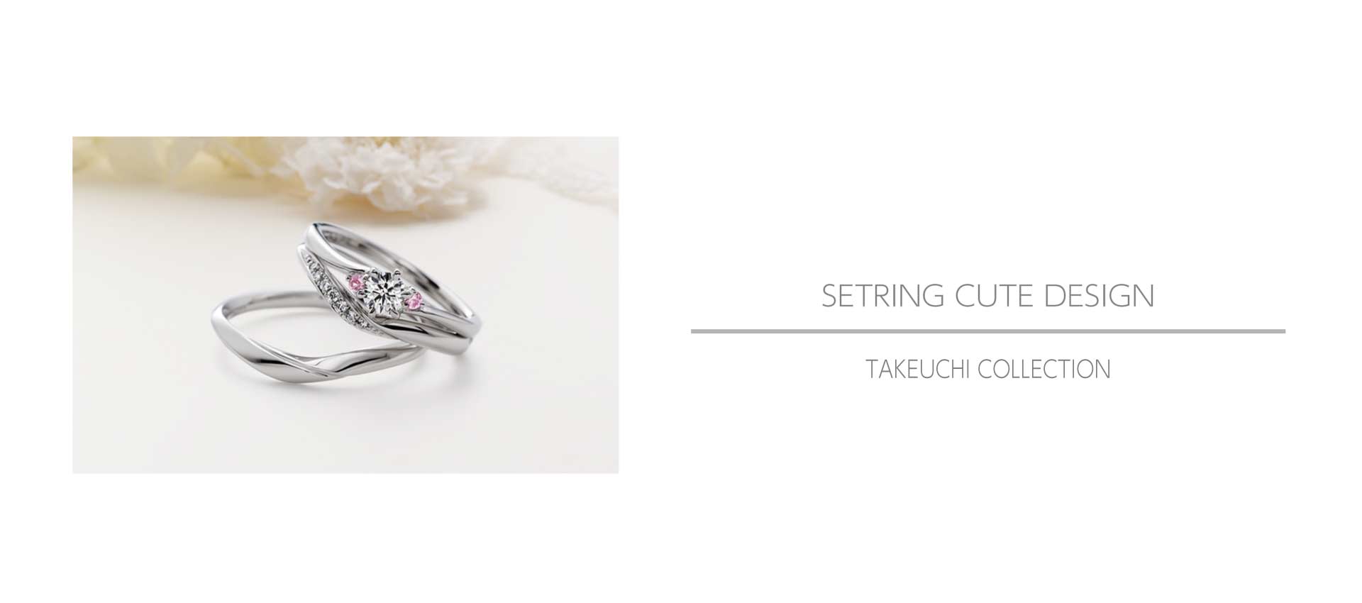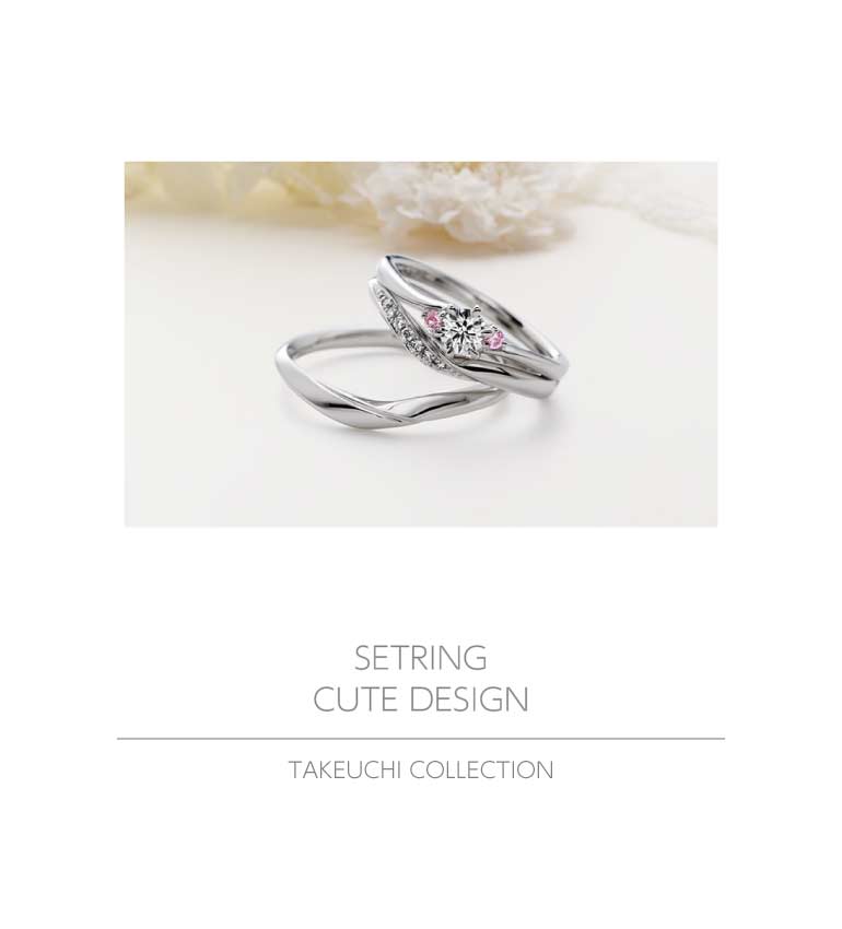 指輪に女性らしさを取り入れたキュートデザイン。リボンやお花、唐草模様にクラウンやティアラ型など、デザインのイメージに取り入れたものも多数ご用意しております。デザイン以外にもピンクのお色味をプラスしたシンプル系のデザインも。さりげなく、女性らしさを感じさせる淡いピンク色は、ふたりの距離感でしか感じられないカラー。ずっと一緒に傍にいる方に、いつまでも女性らしさを忘れないという証なのかもしれませんね。TAKEUCHI BRIDAL富山総曲輪店では、ピンクダイヤモンドをセッティングしたブランドをご用意。アレンジにてホワイトダイヤモンドに変更するなどのサービスもございますので、お気軽にご相談下さいませ。