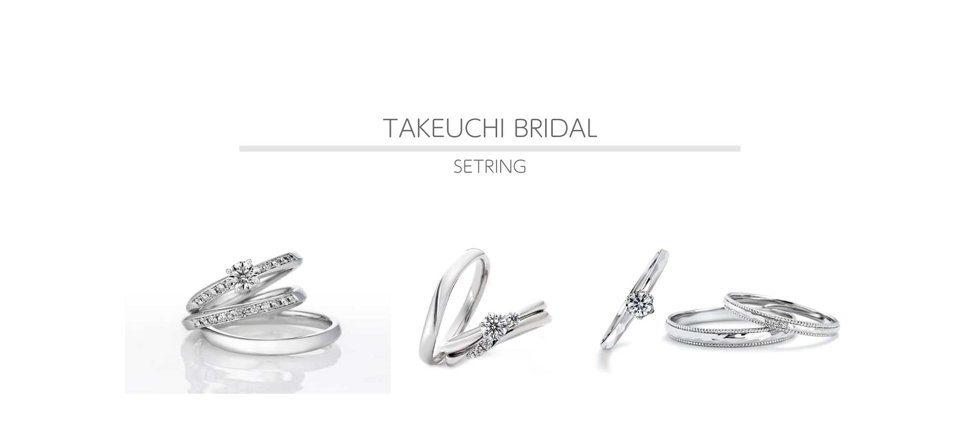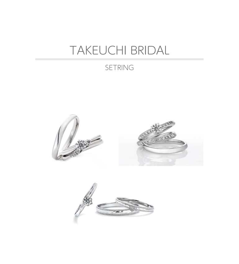 婚約指輪と結婚指輪を重ねて着けるリングをセットリングと呼んでいます。セットリングにも様々なデザインがあり、1つでつけても2本でつけてもストーリー性のあるリングデザインが揃います。タケウチブライダル富山総曲輪店では様々なテイストのセットリングをご用意しておりますので、お客様のお好みに合わせてデザインをお選びくださいませ。